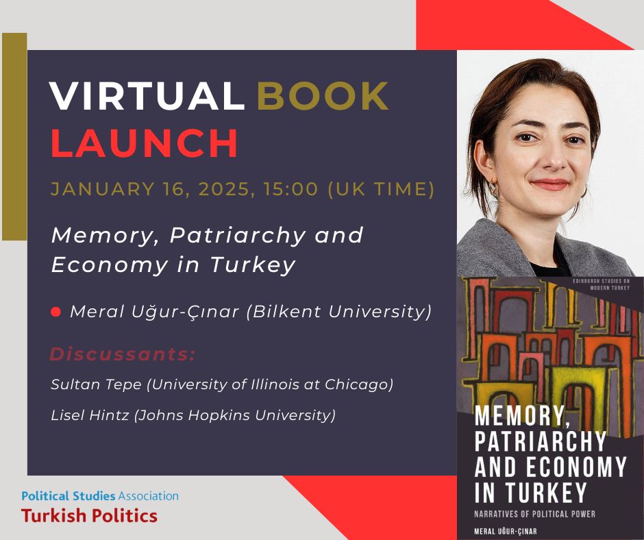We are inviting you to the online launch event of Meral Uğur-Çınar’s (Bilkent University) book, Memory, Patriarchy, and Economy in Turkey: Narratives of Political Power. The book, published by Edinburgh University Press, investigates the interplay between collective memory, economic development, and patriarchy in shaping political narratives in Turkey.